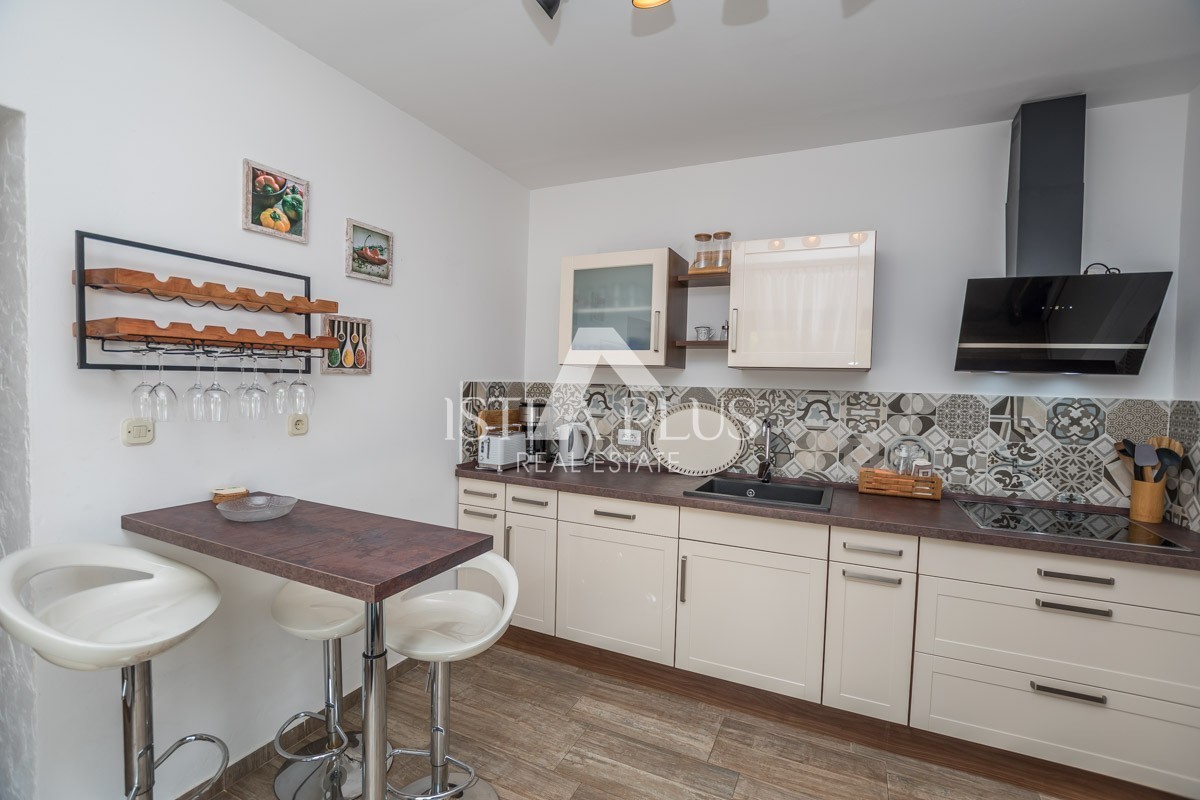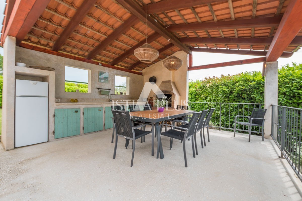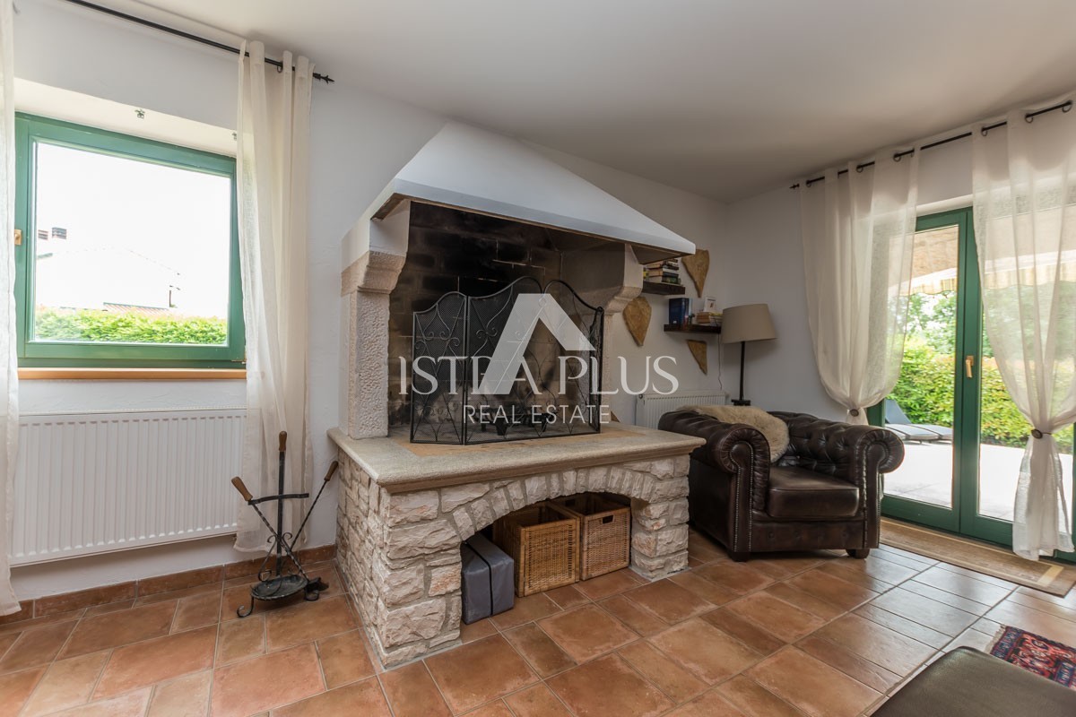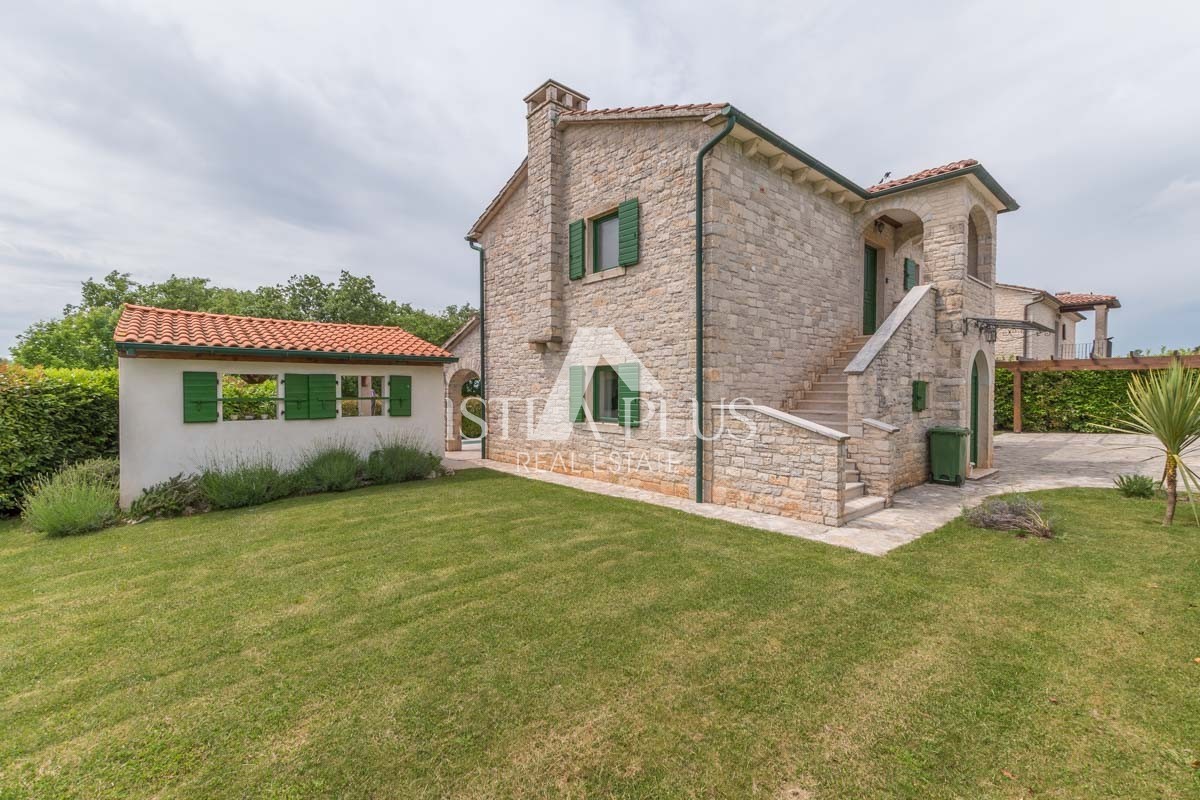 If you are looking for a stylishly decorated Istrian villa with a very special charm, you will love the Villa from this offer. Surrounded by vineyards on the edge of a small Istrian village 3 km from the town of Višnjan. Built on a plot of 667m2 in the traditional Istrian style of construction dominated by Istrian stone decorated with green shutters on the windows and doors exudes a typical Mediterranean charm.