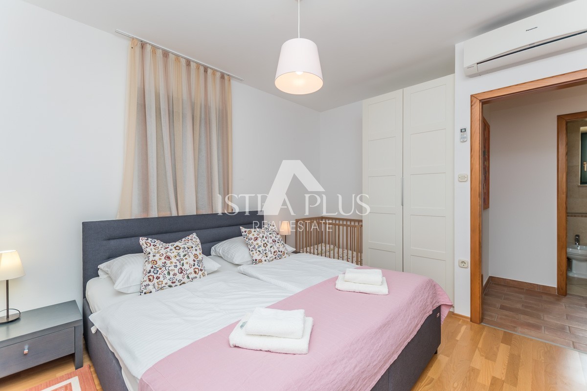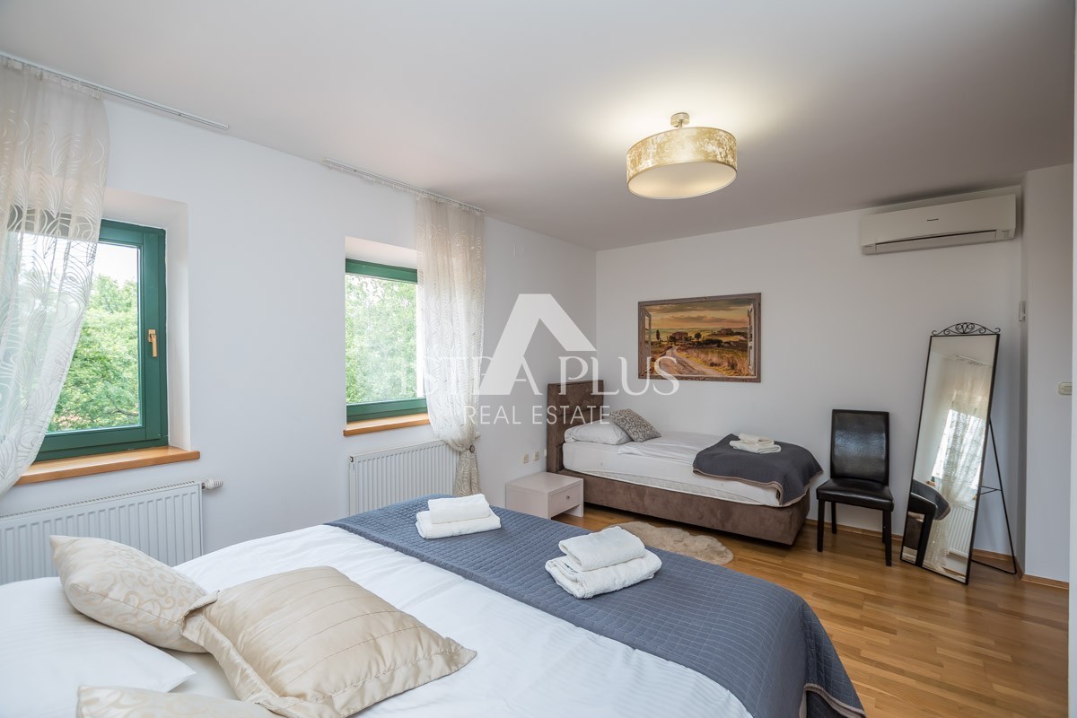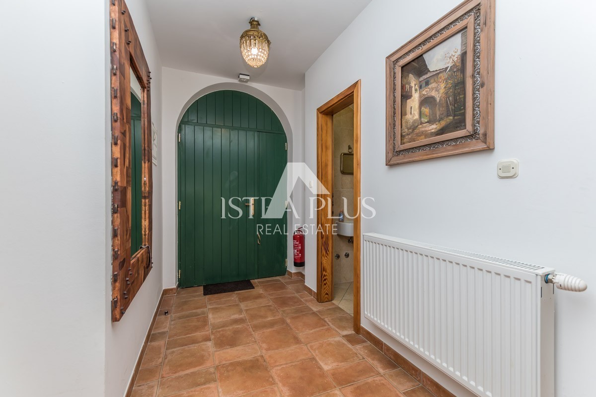 At the very entrance to the ground floor, it is evident that the owner has decorated the villa with great attention to detail, a spacious hallway with a guest toilet leads to a modernly equipped living room with an open fireplace and a fully equipped kitchen and dining room with access to the outdoor terrace and swimming pool. Discreetly separated on the ground floor is a modernly equipped bedroom with a bathroom.