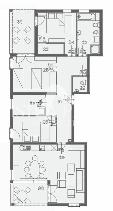 The apartment covers an area of 119 m² and consists of a spacious entrance hall, a bright living room with dining area and terrace, a modern, fully equipped kitchen with top-of-the-line appliances, three bedrooms, two of which have access to the terrace and a fourth, smaller study. The apartment also has an elegant bathroom with a bathtub and shower and a separate guest toilet.